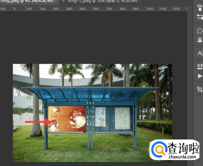 确定保存之后我们回到PS界面,就能够看到实景图片中的展板海报图片被更换了,这样给老板看的话效果就比较直观。