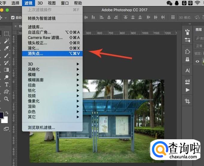 打开展板图片之后点选图层,然后在菜单中点击“滤镜-消失点”