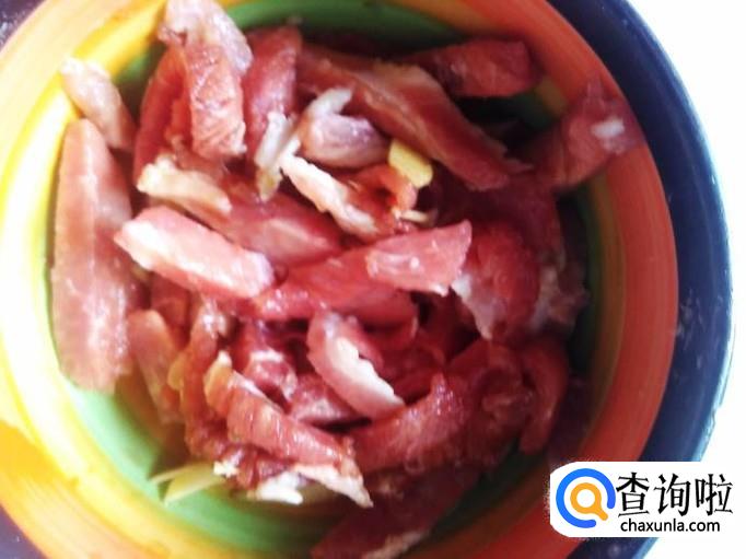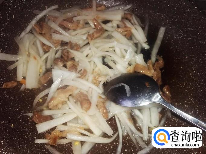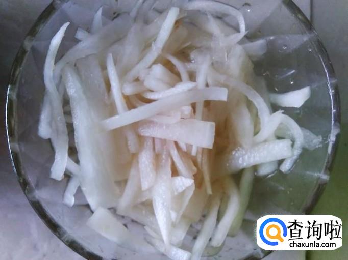 首先把瘦肉切成丝,然后加适量的盐、姜蓉、生抽、料酒搅拌均匀,萝卜也切成丝,撒少量的盐抓捏至软。