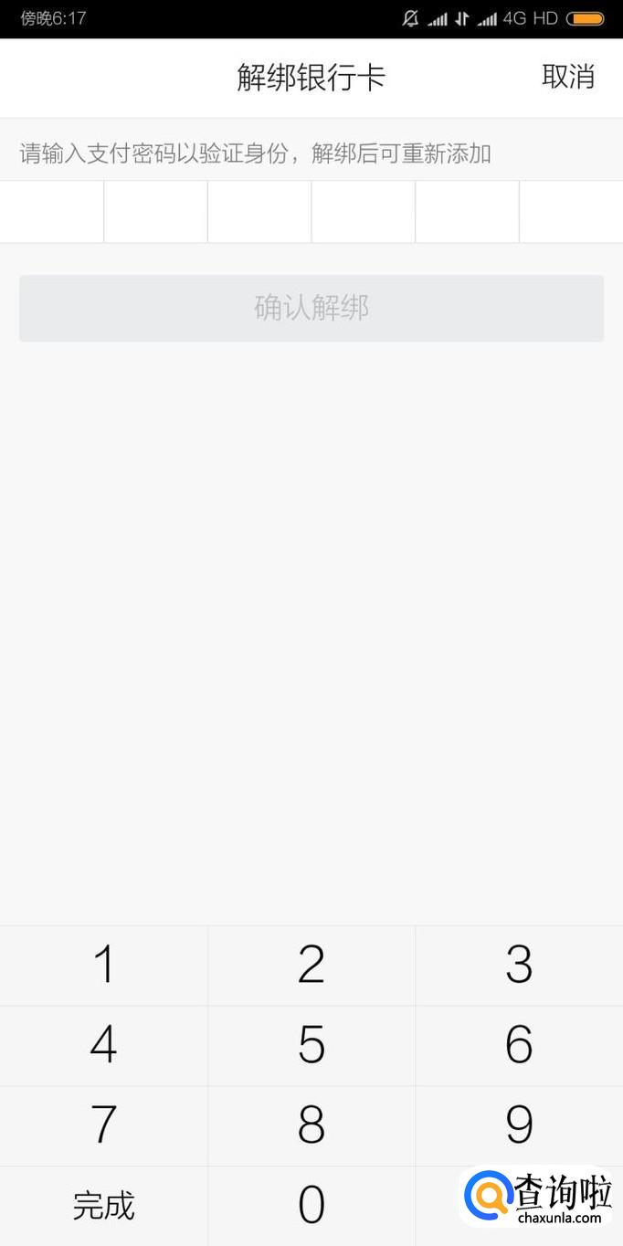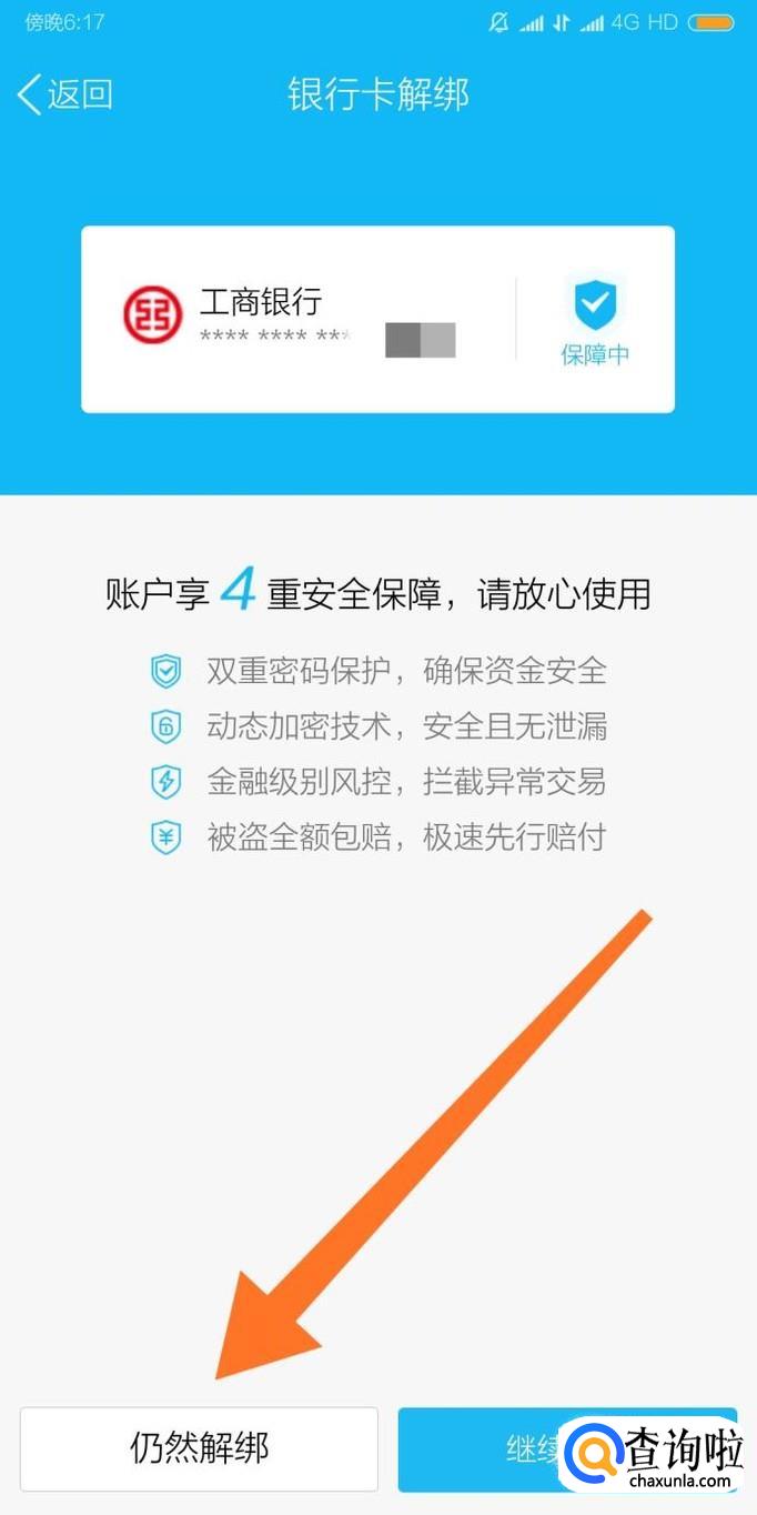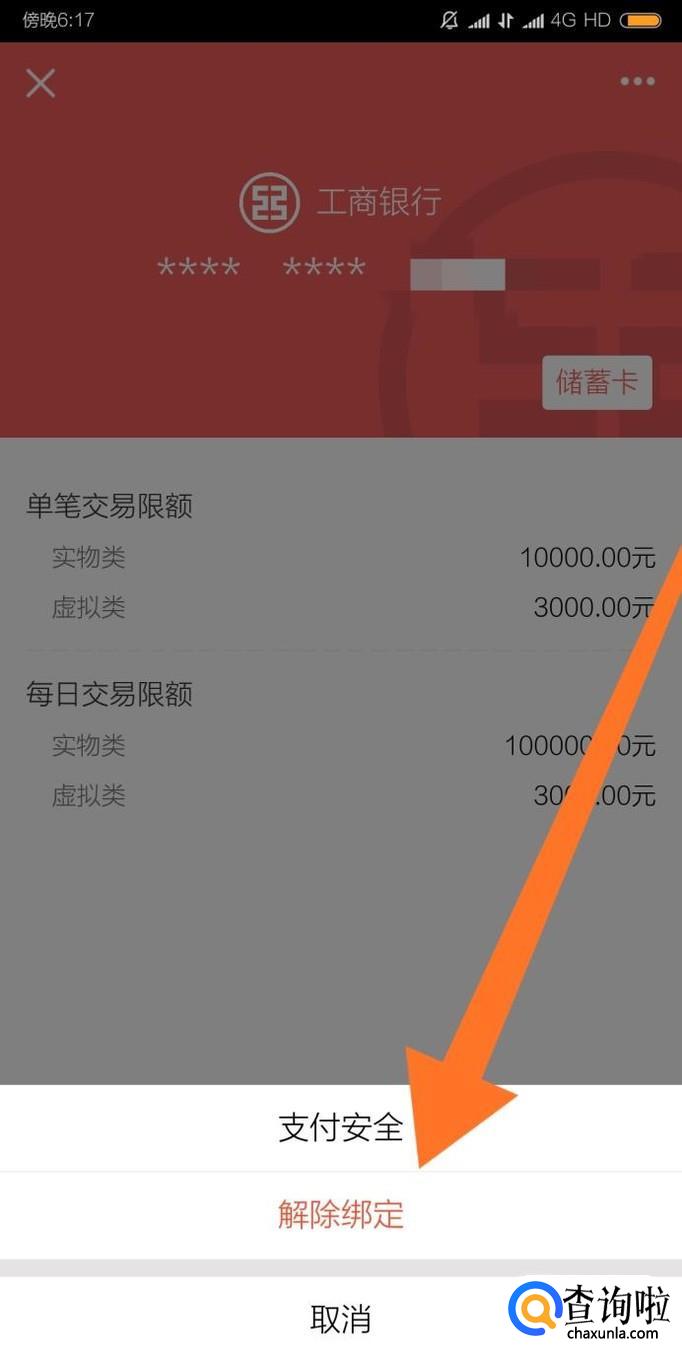 进入银行卡详情页面后,点击右上角的菜单键,选择“解除绑定”选项。