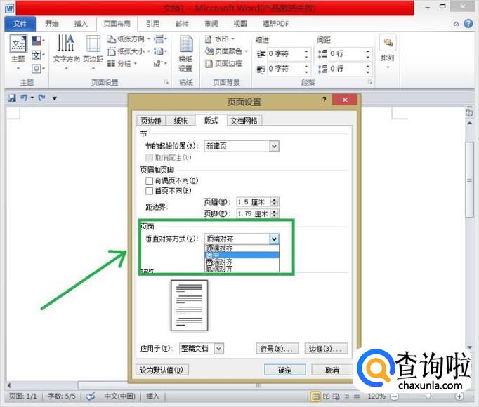 点击”版式“,找到”页面“中的”垂直对齐方式“并选择”居中“