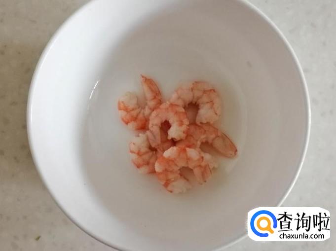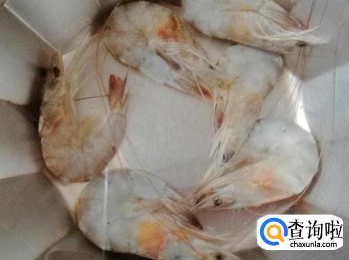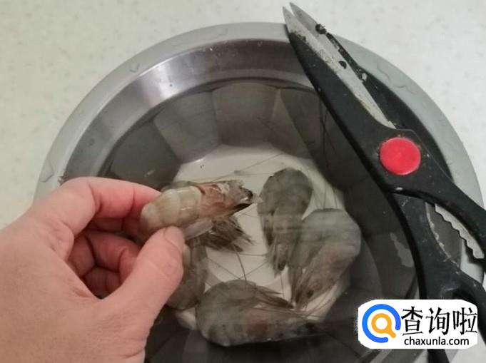 先取出适量小海鲜化冻,把虾放入水中冲洗化开,下面我们先把虾处理一下,用剪刀先减掉须和扎手部分,然后用牙签把虾背的黑线如图取出来,处理完待用。