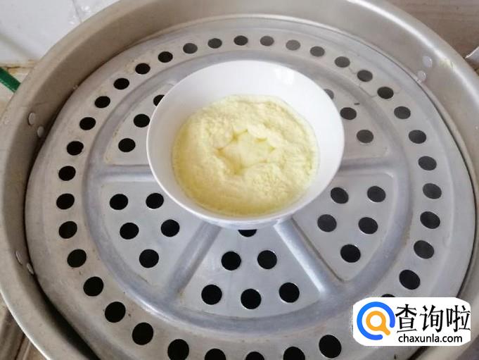 蒸锅放水准备蒸蛋羹,这里我选用的是凉水入锅蒸的,加好水如图放进打好的蛋液,盖上锅盖,开锅上气后改小火三到五分钟就可以熟了,打开锅盖查看一下蛋液凝固已熟关火。