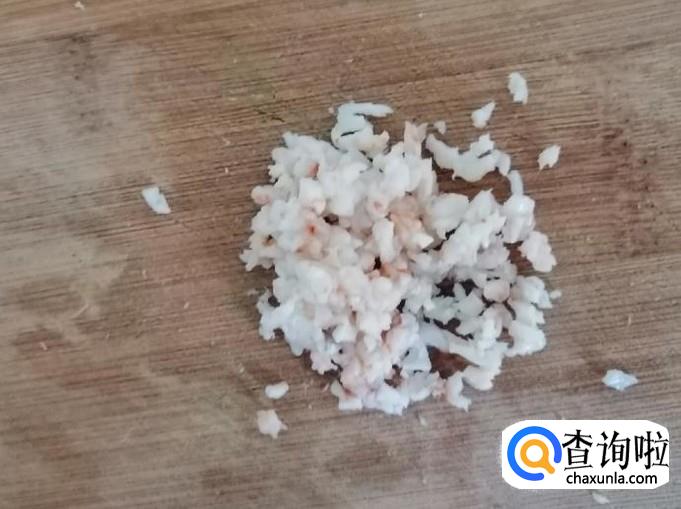 这一步我们要给海虾去皮,等虾自然冷却后,拿一个海虾用手剥掉虾皮,直接都剥成虾仁,把剥好的虾仁用水冲一下,放菜板上切一下,然后剁碎待用。