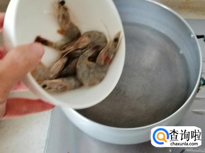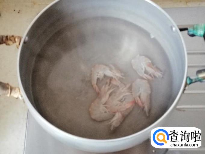 把去了黑线的虾放入容器洗净待用,煮锅放水开火,水开后把洗净的小海鲜放入锅中煮一下。