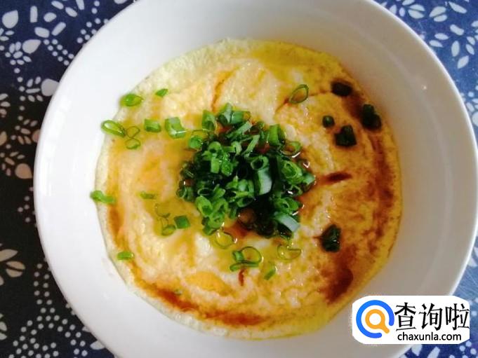 拿出蒸好的海虾鸡蛋羹,取出时候注意不要烫着手,加入早切好的葱花末,倒入香油,根据个人喜欢好,也可以加生抽、香醋都可以。