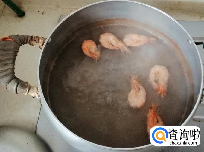 海虾入锅随温度变化,慢慢变红就可以了,这个过程不要煮时间太长,煮开变红如图就可以关火,捞出小海鲜放入碗中待用。