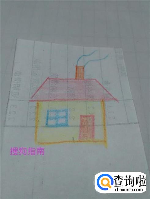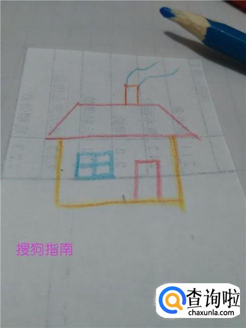用蓝笔在烟囱上面画两条曲线,表示烟。