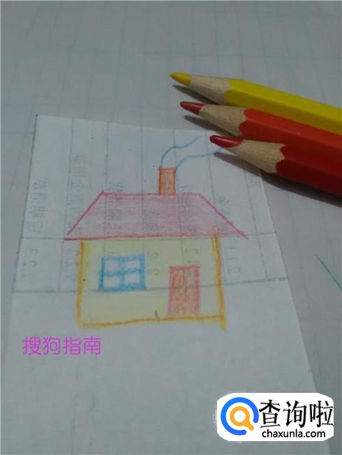 最后用红笔涂房顶,用黄笔涂房子的墙壁,用桔色笔涂烟囱和门,漂亮的小房子就画完了。