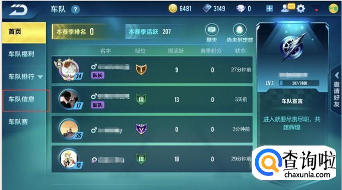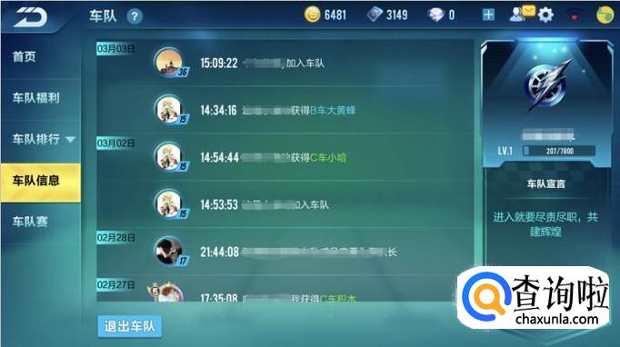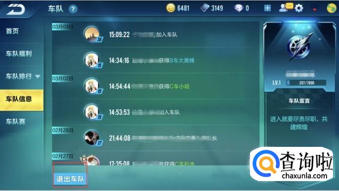 在“车队信息”栏目中就可以查看车队的相关操作与车队人员的动态。退出车队就需要在该页面进行操作。
