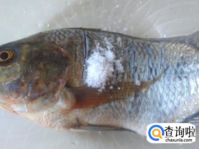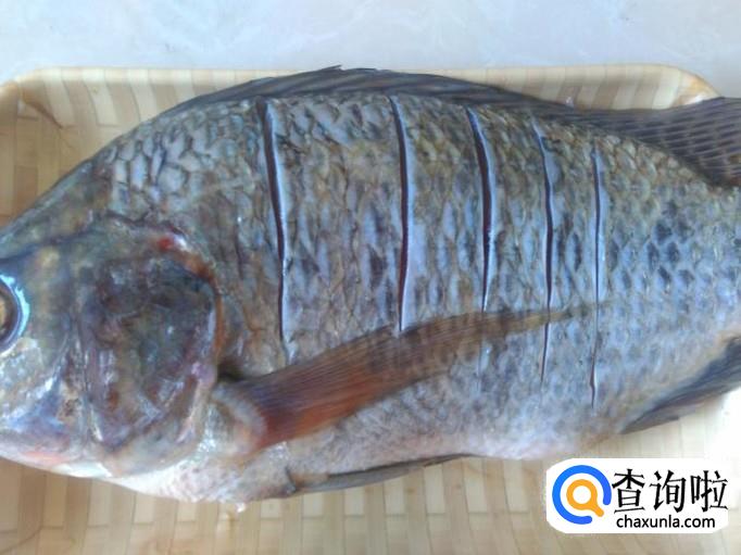 首先把罗非鱼清理干净,然后在鱼身均匀地切连刀,再用盐全面刷过。