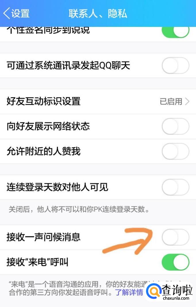 进入“联系人、隐私”后,将页面下拉到底部,看到“接收一声问候消息”的选项,