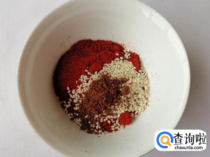 把准备好的白芝麻放入辣椒面碗中,加入一勺五香粉,再加入备好的一勺食盐,所有食材都放好备用。