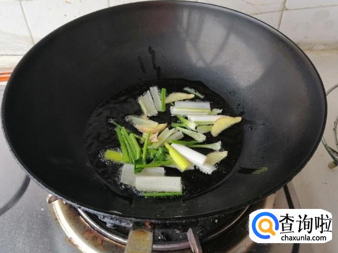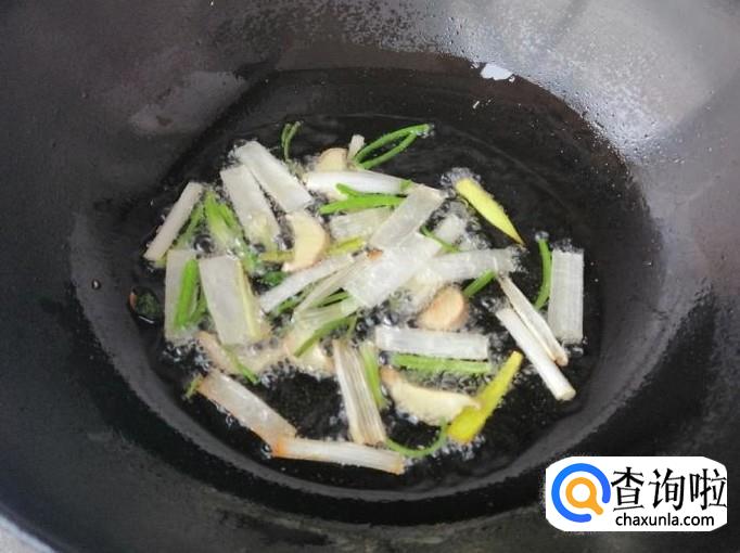 炒锅放油,油热后加入备好的葱、香菜杆、姜片用筷子拨动炸出香味,炸至葱、香菜、姜片微黄捞出,剩下热油就可以泼辣子了。