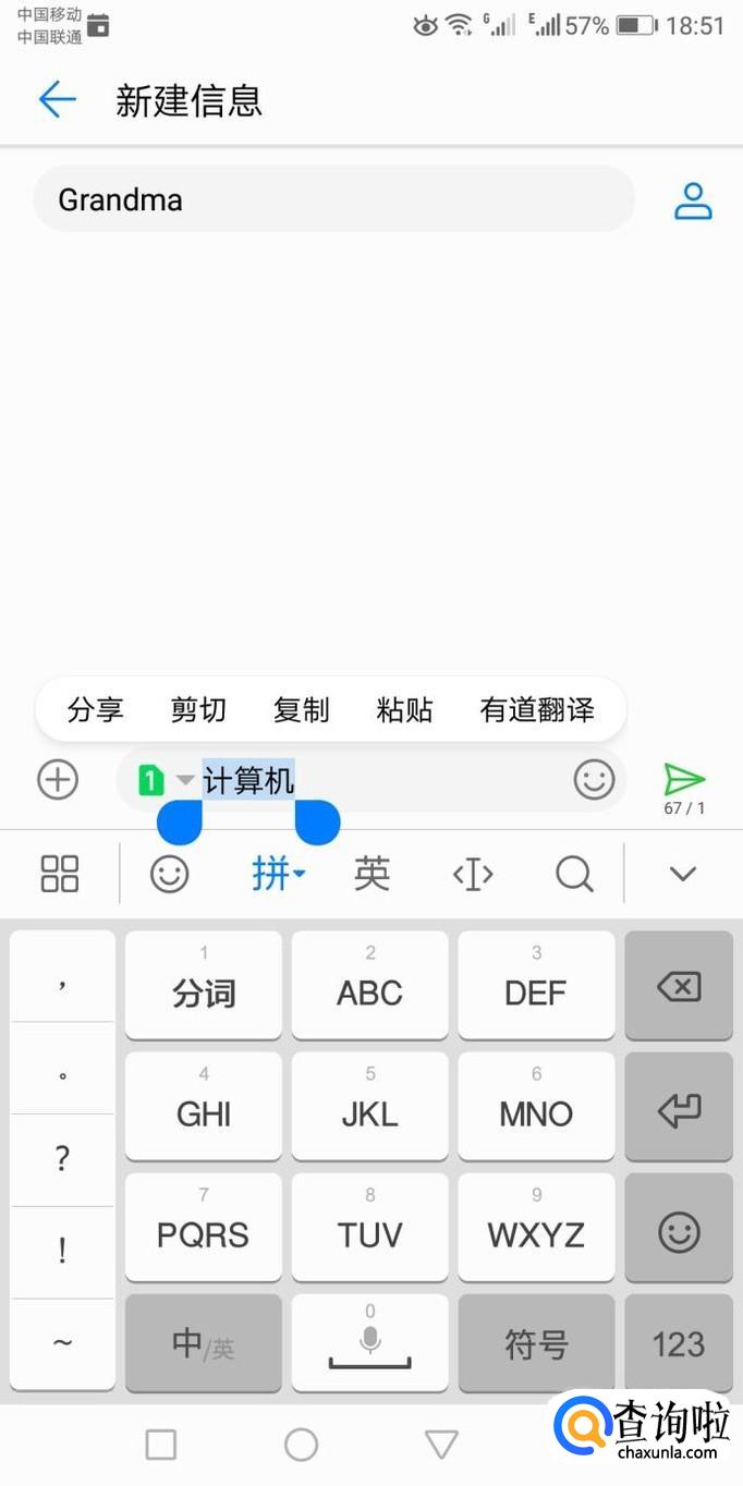 首先我们打开发送短信界面,以短信界面为例。输入一些文字,比如输入计算机