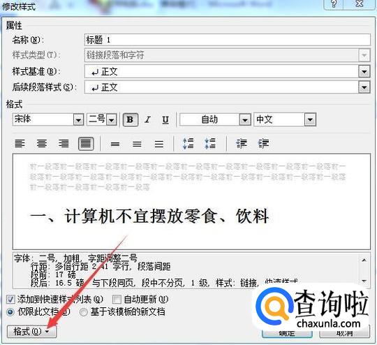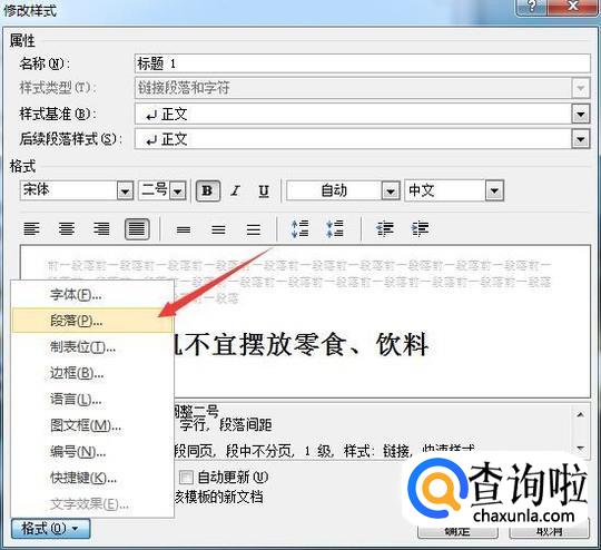 在修改样式对话框中,点击左下角的格式按钮。在弹出的菜单中点击段落。