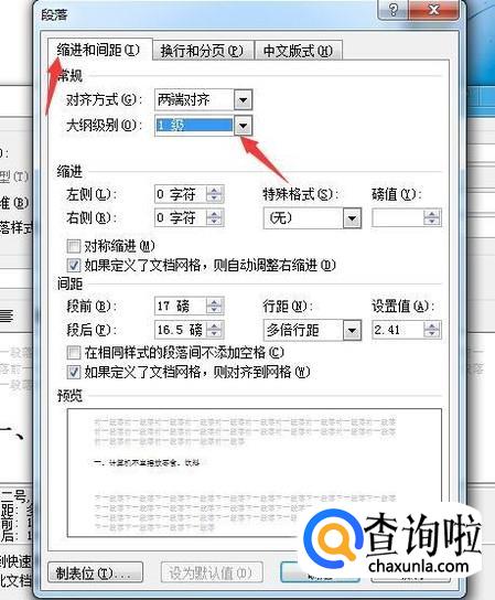 弹出段落对话框,在大纲级别后面的下拉框中点击就可以设置标题1所属的大纲级别了