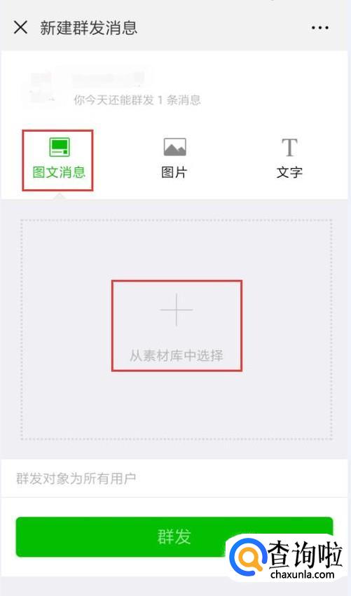 点击“群发”,在“群发消息”界面选择“图文消息”,点击下面的“从素材库中选择”。