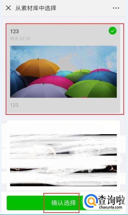 选中素材库中编辑好的图文消息,点击下方的“确定选择”,然后点击“群发”按钮,就能把刚刚选择的图文消息推送出去了。