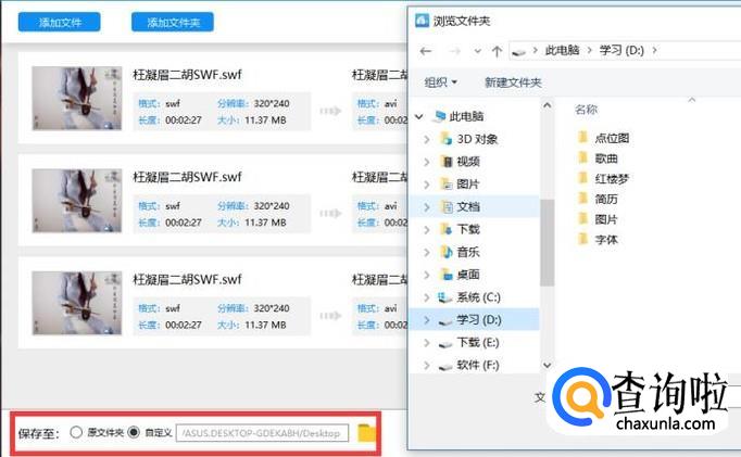 选择下方的自定义,点击文件夹按钮后,会弹出选择视频输出地址的对话框,选择为桌面,