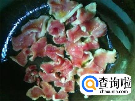 锅里倒油烧热,把肉片放进去快速划开,让肉片变色,一定要全部变色哦,加上一点食盐和生抽。