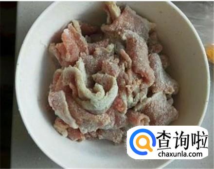 瘦肉切成片,加上料酒抓匀,然后撒上一点食盐、蚝油、生抽抓匀,撒一些淀粉抓一下。