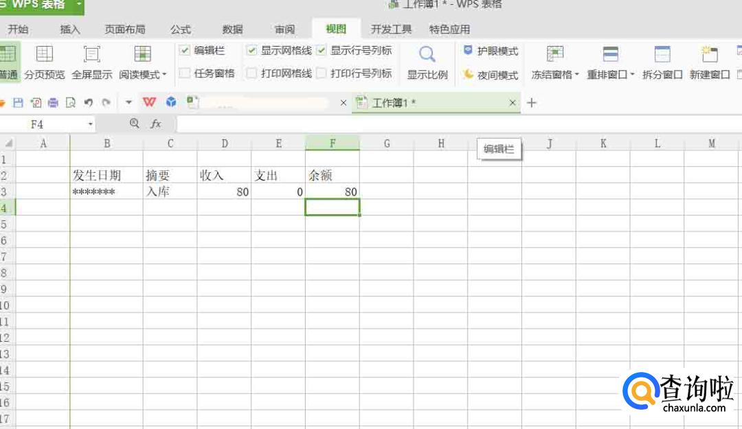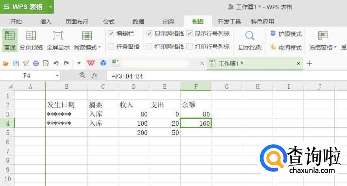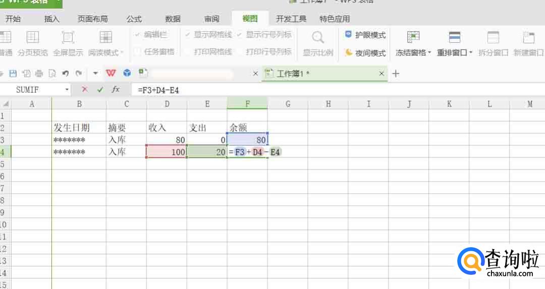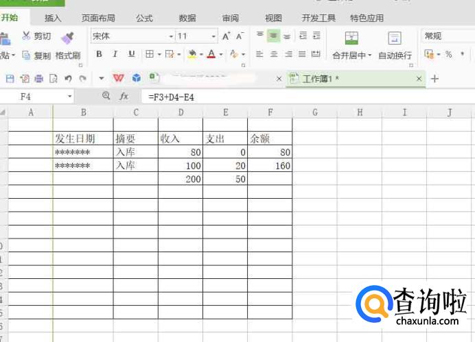 依次输入数据,余额下输入公式:F3+D4-E4。