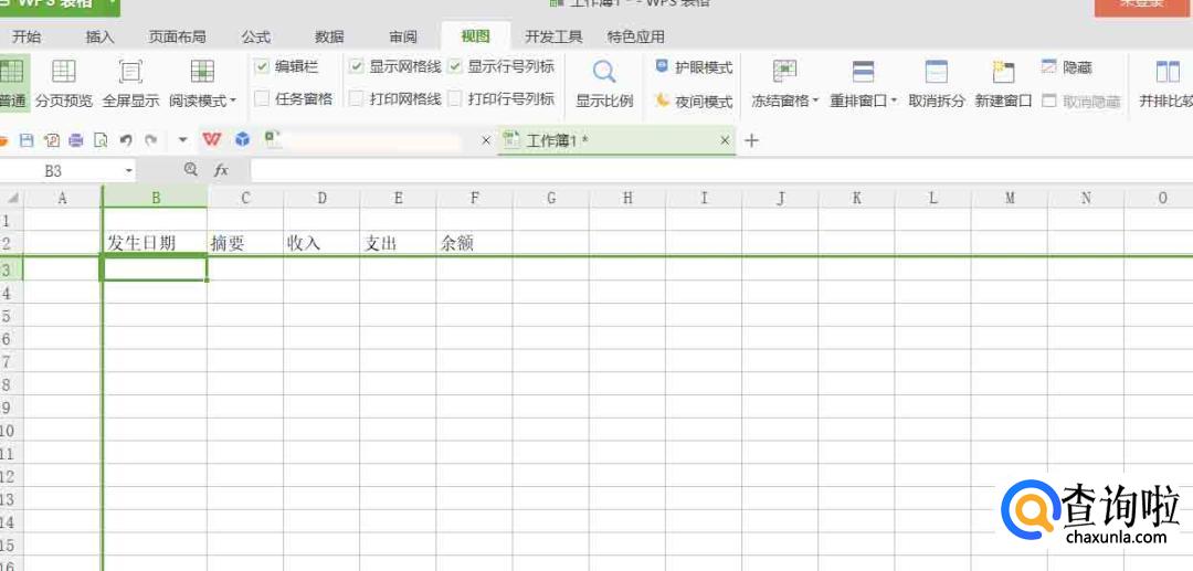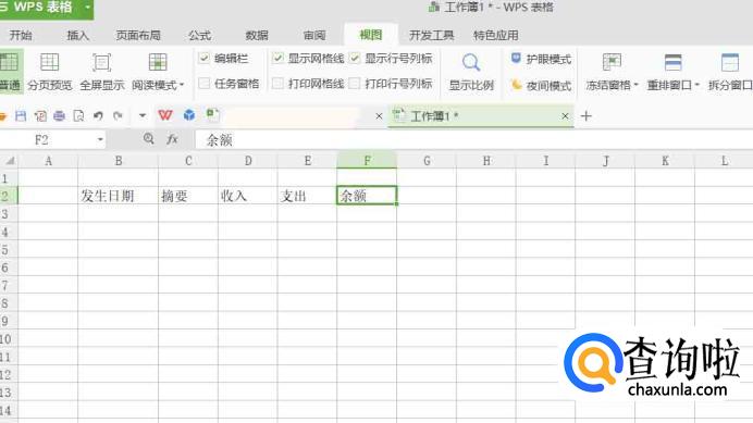 在电脑上打开表格软件,输入表头文字:发生日期、摘要、收入、支出、余额。