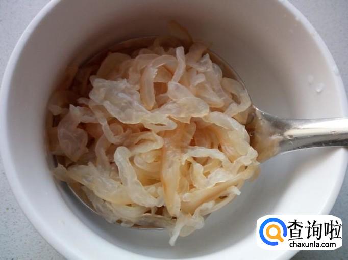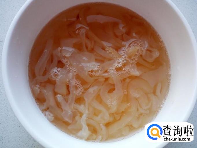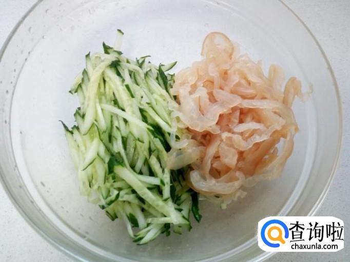 海蜇皮用水清洗干净,用刀切成丝,放入水中浸泡两小时(比较咸的,泡的时间要长一些),去咸味,然后再用水冲洗干净,控干水分。