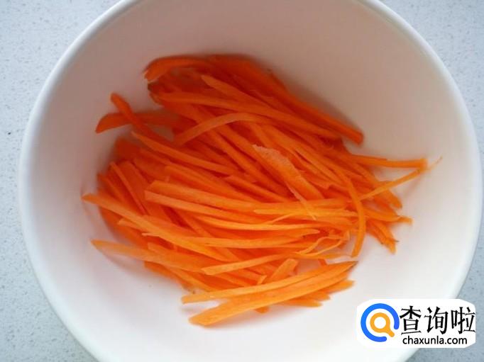 香菜收拾清洗干净,控干水分,切成段。胡萝卜去皮,用水清洗干净,控干水分,切成丝。