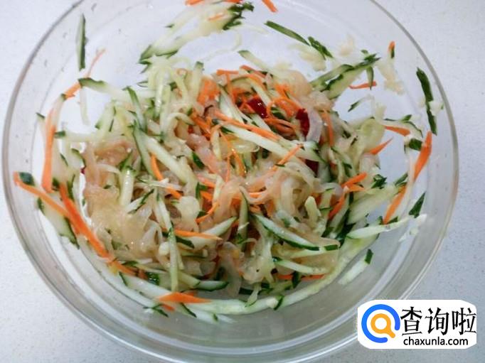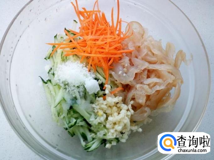 把切好的海蜇皮丝,黄瓜丝,胡萝卜丝,蒜末一起放入碗中。放入少许盐,味精,白糖,醋,拌和均匀(尝一下,如果海蜇皮比较咸,就不要放盐)。