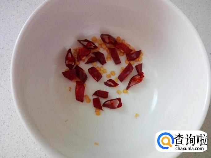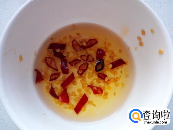 锅内放入油加热,油七,八成热时,关火。稍凉后,倒入红干椒碗中,炸成辣椒油。