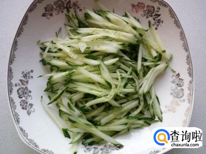 黄瓜用水清洗干净,控干水分,切成丝。