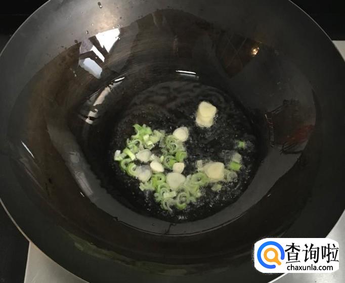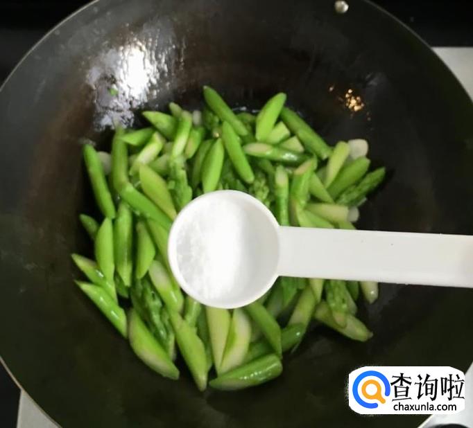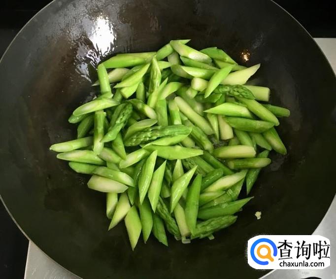 热锅加入适量的花生油放入葱花、蒜片爆香,倒入芦笋段大火翻炒均匀