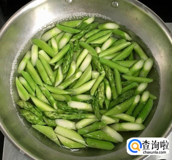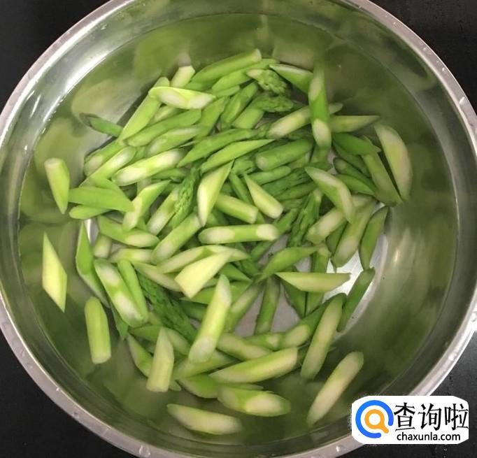 清洗干净的芦笋切成滚刀段,锅中加水煮沸加一点点盐放入芦笋段焯水1分钟,捞出反复用冷水冲洗过凉后沥干水分备好