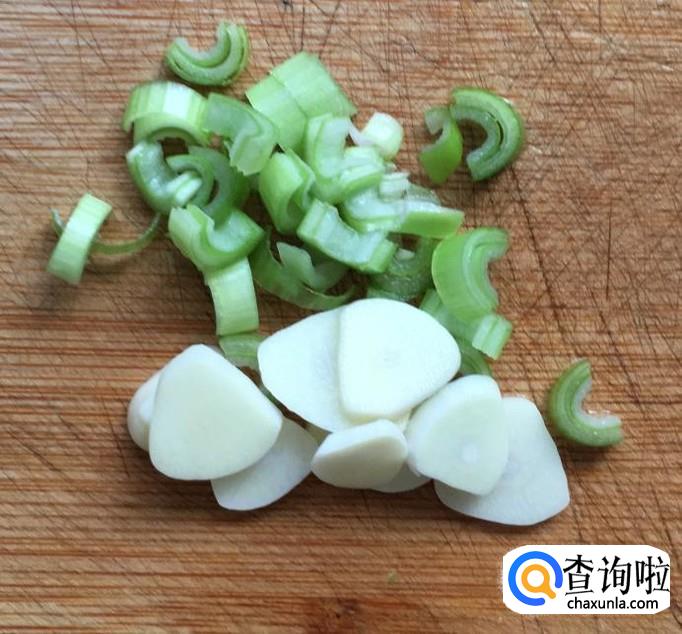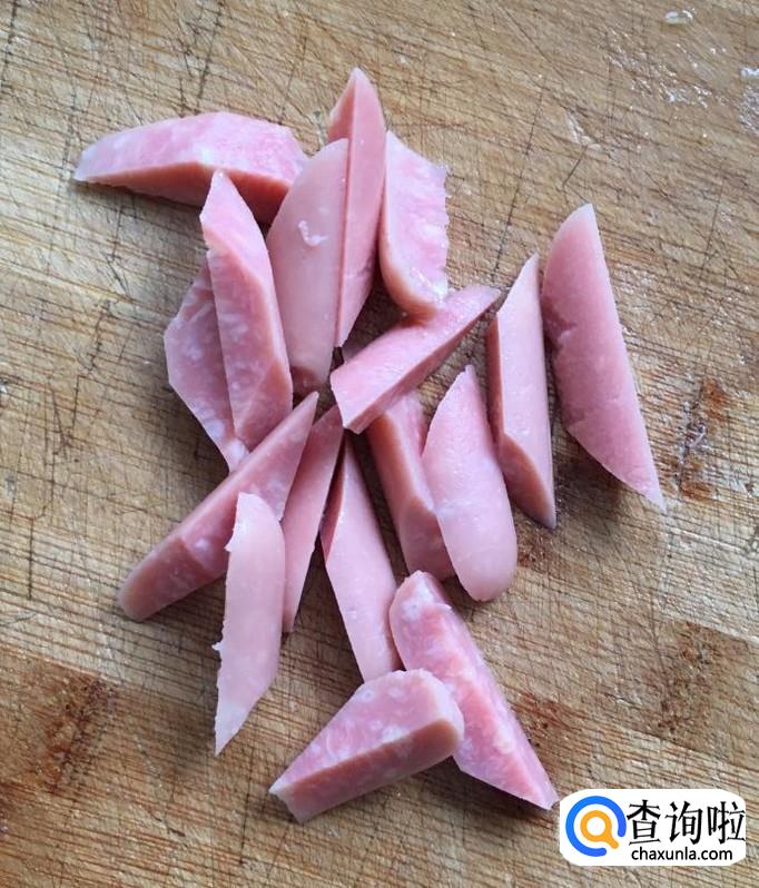 火腿肠一根竖刀切成四份再切成滚刀段,葱、蒜剥去外皮清洗干净分别切成葱花、蒜片备好。