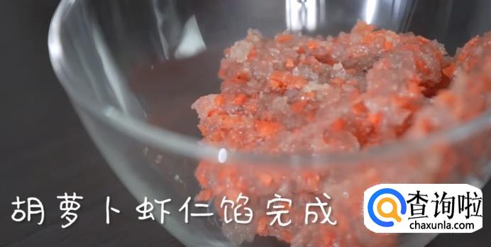 胡萝卜剁碎,将虾仁切块,再将虾仁和胡萝卜混在一起剁成肉馅。