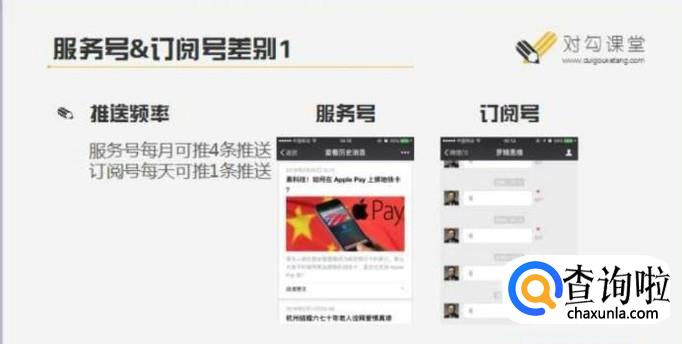 服务号为用户提供服务的,一个月只能发送4次群发消息,而且消息可以显示在用户的聊天记录里面,相对来说比较受限制。