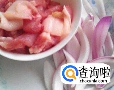 将洋葱切成粗粗的条,将猪肉切成薄片。