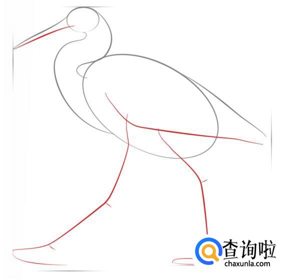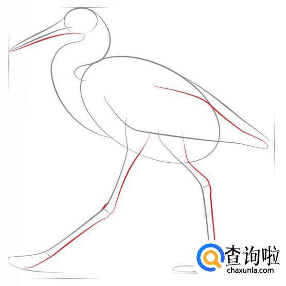 先确定白鹭头和身体的位置。红色线表示新增的线条。