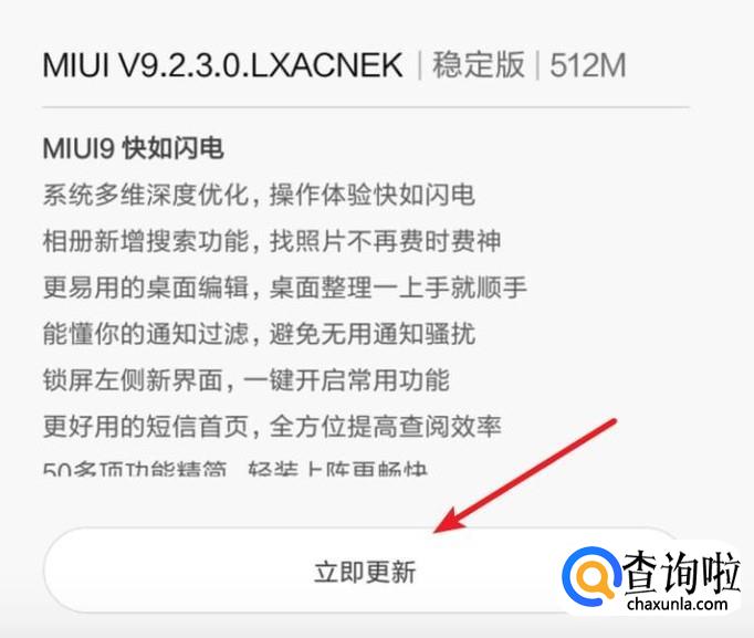 点击后,就会自动检查是否有比现更新的系统,如果有,则会显示出来,并提供一个‘立即更新’按钮。我们点击它就可以更新了。