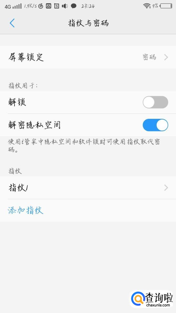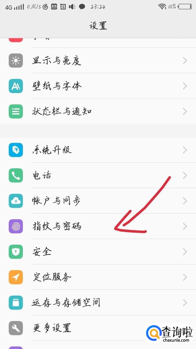 向下滑动手机,点击“指纹与密码”这个选项,如图1箭头所示。会出现一个新的界面,如图2所示。
