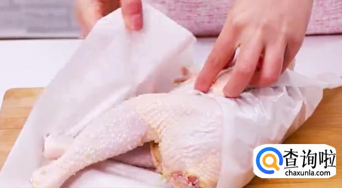 用厨房纸吸干鸡肉表面的水分。