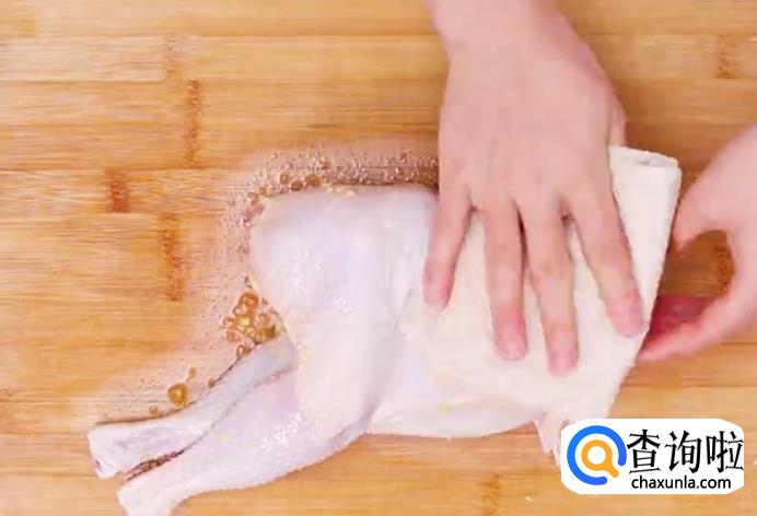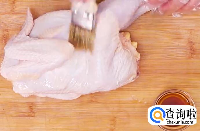 用刷子给鸡刷上一层料酒。