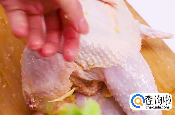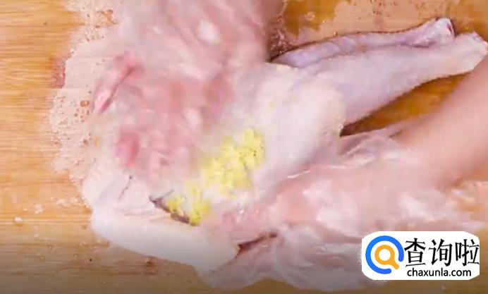 抹上沙姜碎末后给鸡肉按摩,来回揉搓。