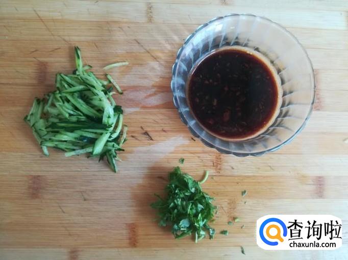 取一个小碗,放入2勺味极鲜酱油,2勺香醋,1勺香油,1小勺盐,1勺蒜末,1小勺味精,搅拌均匀,制成调味汁,再把黄瓜洗净切成丝,香菜洗净切成小段,