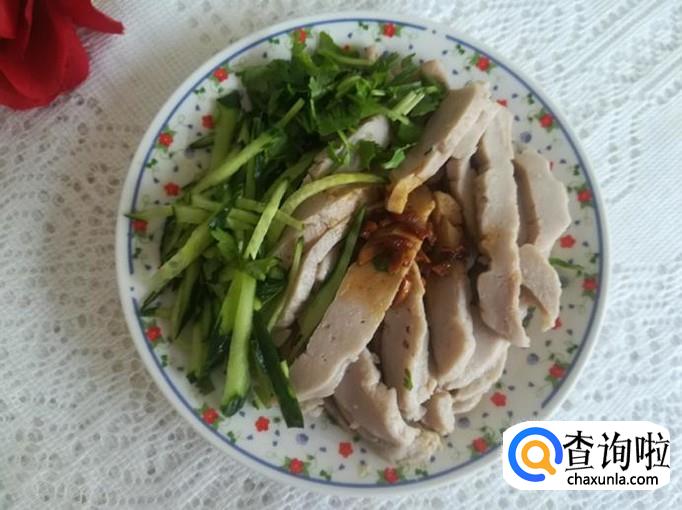 把晾凉的面团切成条状放盘里,浇上调味汁,加入黄瓜丝,香菜段就可以享用了。