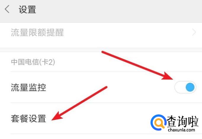 打开后,把流量监控打开,然后点击下方的套餐设置。