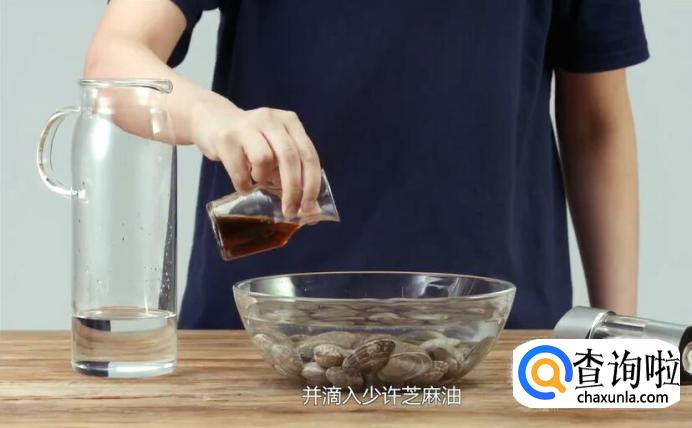 首先处理花蛤,将花蛤放入较大的容器中,倒入温水,加入海盐,并滴入少许芝麻油,静置3小时,让花蛤吐净泥沙。
