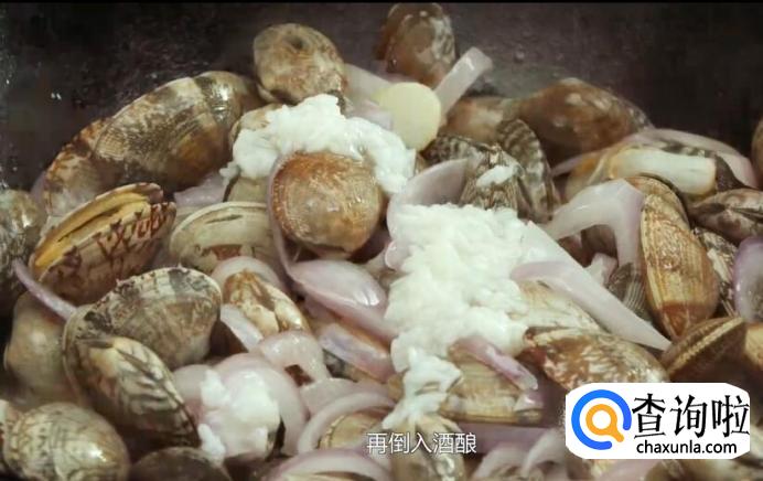 然后倒入花蛤爆炒,锅中先烹入花雕酒,再倒入酒酿。